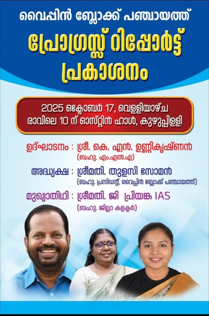 വൈപ്പിൻ: വൈപ്പിൻ ബ്ലോക്ക് പഞ്ചായത്ത് പ്രോഗ്രസ്സ് റിപ്പോർട്ട് പ്രകാശനം വെള്ളിയാഴ്ച രാവിലെ 10 മണിക്ക് കുഴുപ്പിള്ളി ഓസ്റ്റിൻ ഹാളിൽ വെച്ച് നടക്കും. കെ എൻ ഉണ്ണികൃഷ്ണൻ എം എൽ എ പരിപാടിയുടെ ഉദ്ഘാടനം നിർവഹിക്കും. ബ്ലോക്ക് പഞ്ചായത്ത് പ്രസിഡന്റ് തുളസി സോമൻ അധ്യക്ഷത വഹിക്കുന്ന പരിപാടിയിൽ ജില്ലാ കളക്ടർ ജി പ്രിയങ്ക ഐ എ എസ് മുഖ്യാഥിതി ആയിരിക്കും.